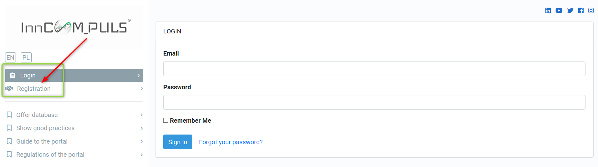 The InnCOM_PULS portal can be accessed at www.inncompuls.com. The portal is navigated by means of a side menu, which is on the left of the main screen. After selecting the portal address, log in to your account or register if you are a new user. To do so, select the Log in or Register tab from the side menu. Two types of users be registered: scientific entities and entrepreneurs.