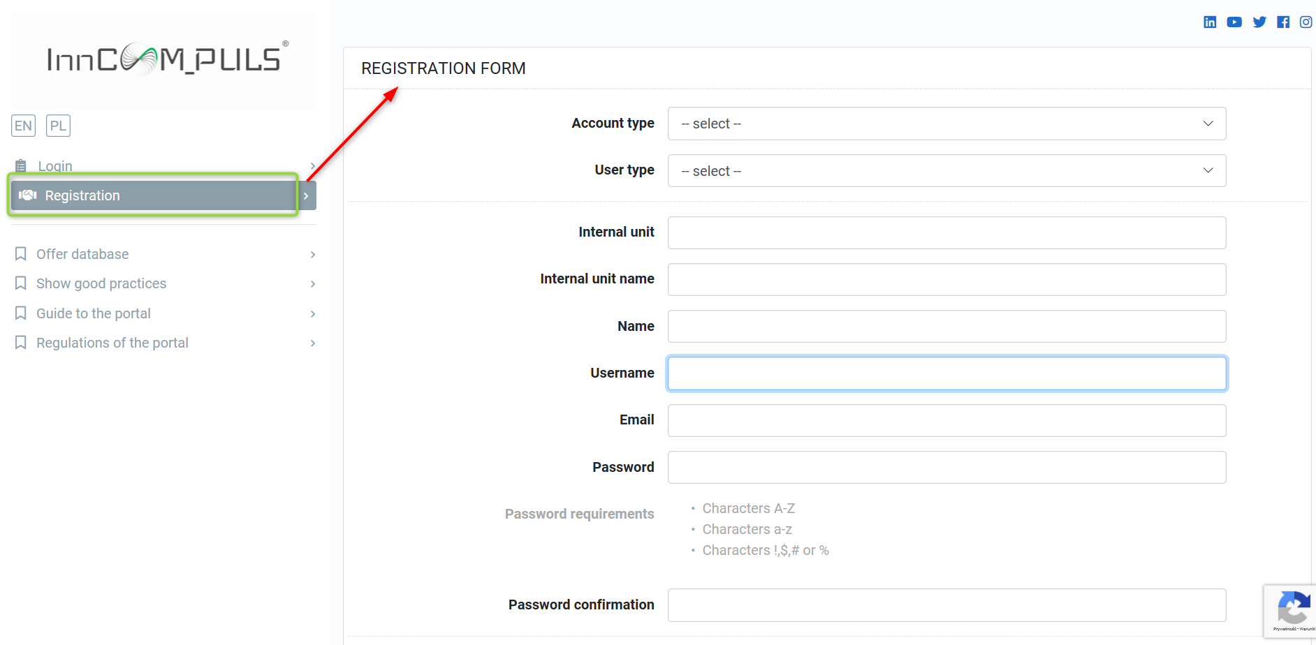 All fields with required data must be filled in the registration form. It is also necessary to accept the Regulations, which specify the terms of use of the portal.