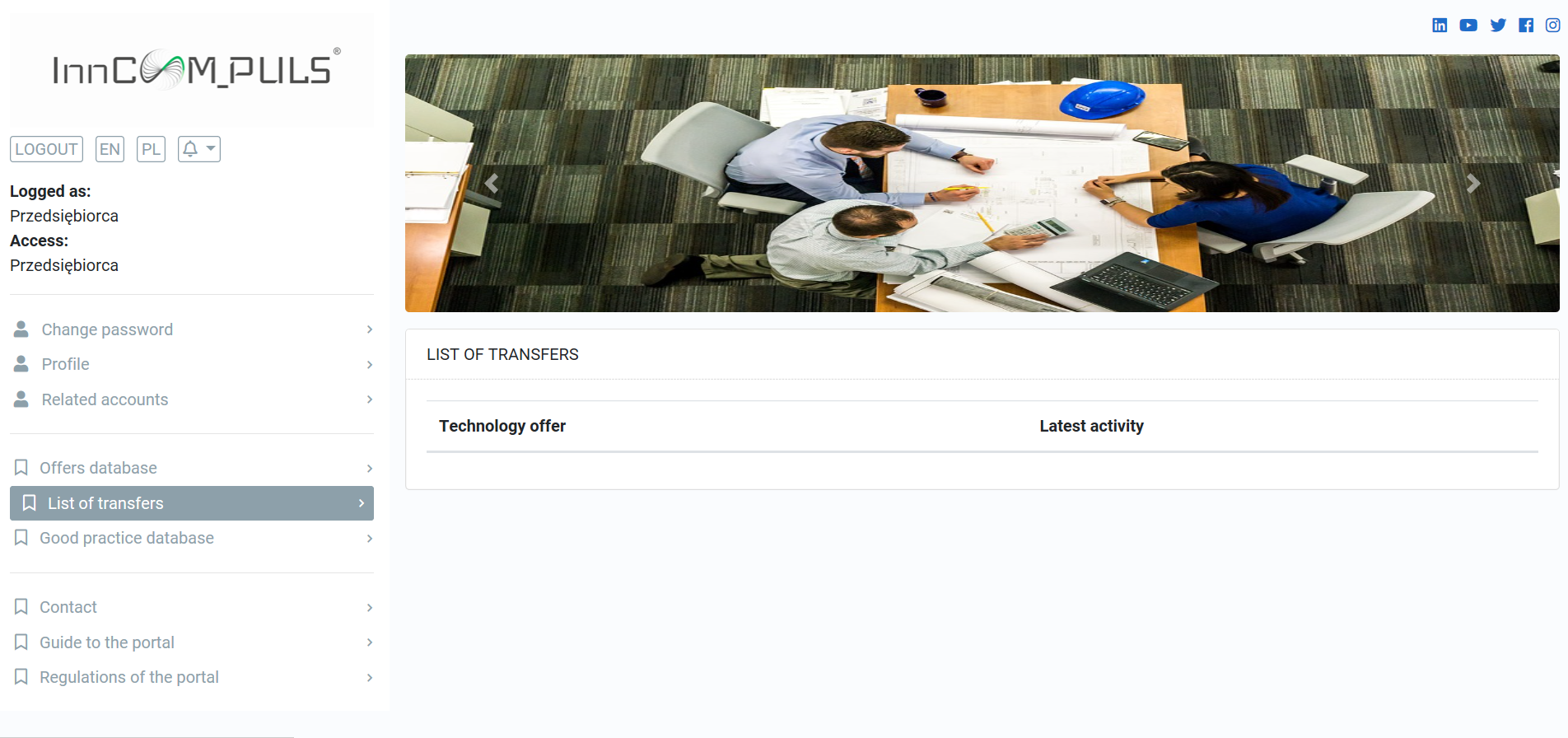 The database of technological offers and the database of good practices will be visible after the Administrator has published them for all Users (logged in and not logged in).