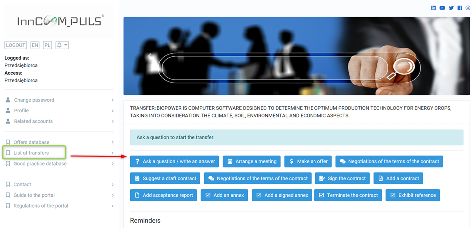 The portal offers various functionalities for scientific entities offering technologies and for entrepreneurs, who are potential clients. It also offers a common functionality for these Users, i.e. a technology transfer module that allows parties to communicate in the commercialisation process. The module helps Users to handle transaction processes, i.e. to offer innovative technologies through technology transfer centres at universities and other scientific entities, and it helps entrepreneurs to submit their purchase offers. Thanks to the portal functionalities it is possible to record the circulation of information and documents and to communicate to negotiate the conditions of the acquisition of rights to technology in the process of commercialisation of scientific research results and development works. Apart from that, the portal enables scientific units to present their portfolio of technologies or good practices and to use E-Mentor – a virtual commercialisation advisor or a tool for benchmarking the commercialisation processes carried out by technology transfer centres. Entrepreneurs can use the portal to browse technological offers and examples of good practices from scientific entities, and they can present the offer of capital funds financing scientific research and development works. The portal also provides Users with training materials and publications concerning the commercialisation of R&D results.