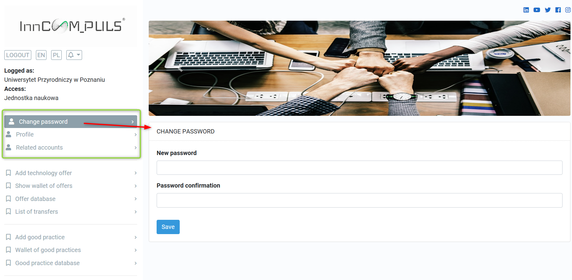 If the User (scientific entity or entrepreneur) wants to change the password or add another person within their User Account, they should do it in the Change password and Linked accounts tabs, respectively.