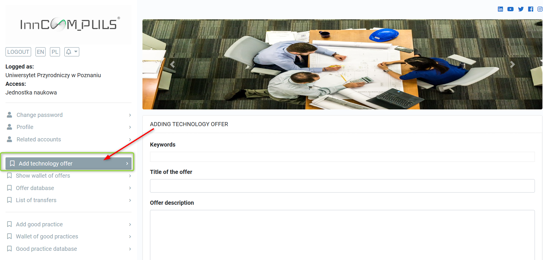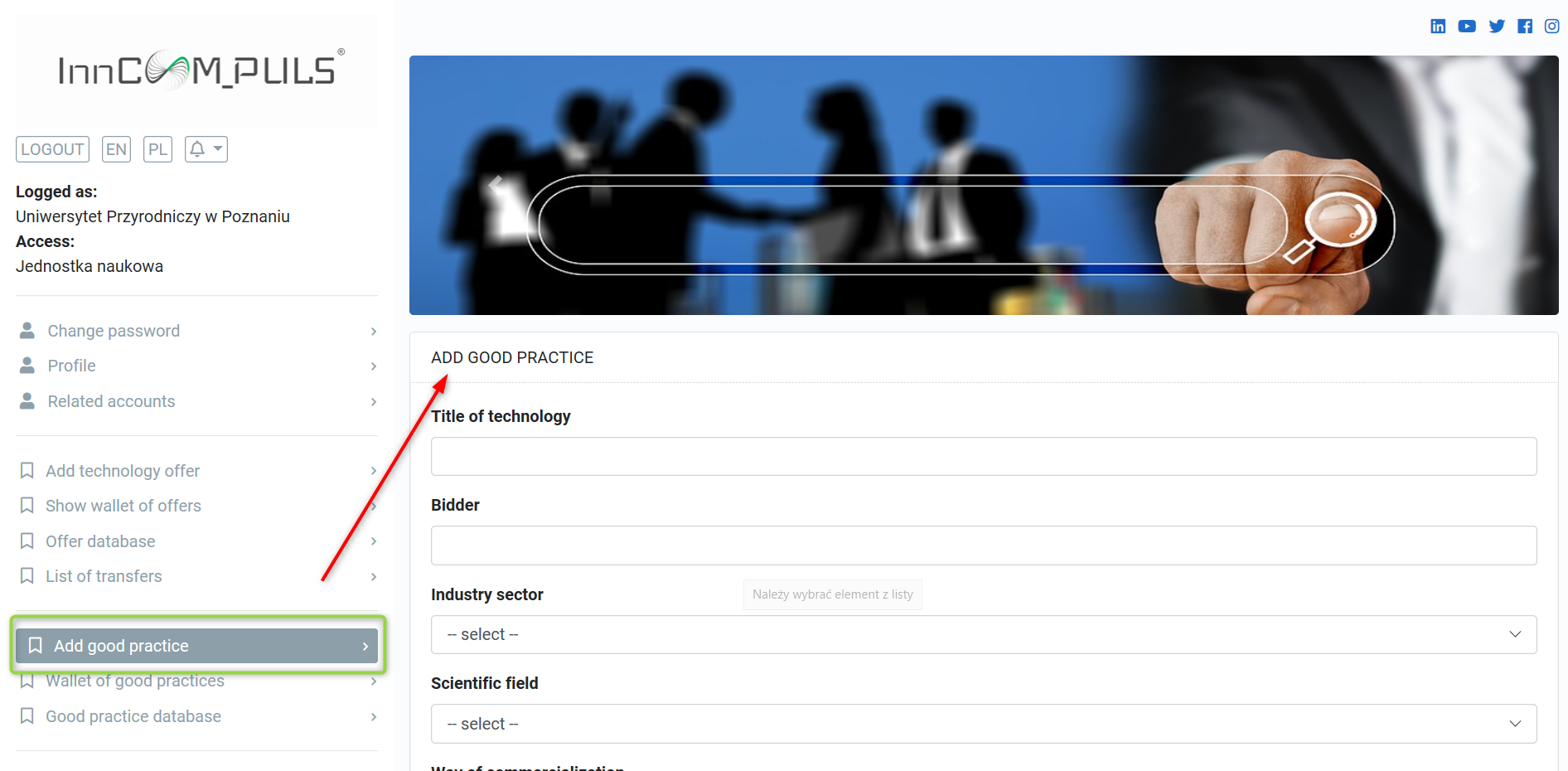 After logging in a registered User (scientific entity) can enter data into the Offer database and Good practices database tabs by following the instruction and filling in forms in appropriate tabs in the side menu on the left, i.e. Add technological offer and Add good practice. After entering and saving the required data, they are sent to the Administrator for acceptance. The data will be published on the portal after receiving an email from the Administrator.